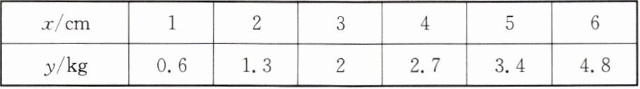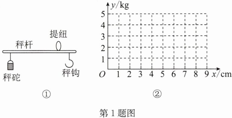 (2) 当秤杆上秤砣到提纽的水平距离 $ x $ 每增加 $ 1\ cm $ 时,秤钩所挂物重 $ y $ 增加______ $ kg $。