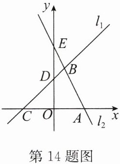 14. (15分)(2024·宿豫期末)如图,已知直线$l_{1}:y =  x + 4与过点A(4,0)的直线l_{2}交于点B(\frac{4}{3},m)$,与$x$轴、$y轴分别交于点C$,$D$,直线$l_{2}交y轴于点E$.