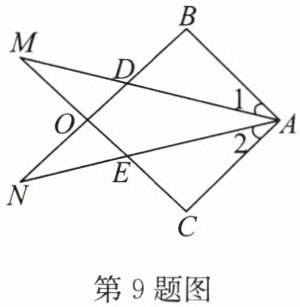 9. $\triangle ABN和\triangle ACM$的位置如图所示,$AB =  AC$,$AD =  AE$,$\angle 1= \angle 2$。求证:(1)$BD =  CE$;(2)$AM =  AN$。