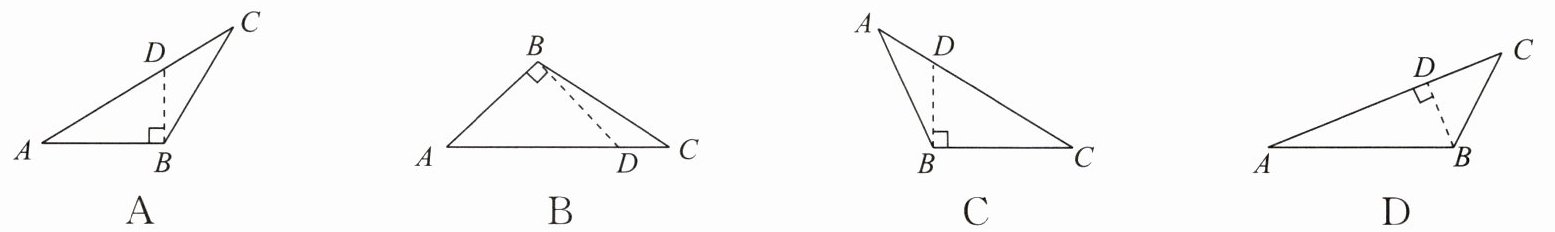 在选项D中,过点D作AB的垂线,垂足为B,线段BD是点C向对边AB所在直线作的垂线,符合三角形高的定义。