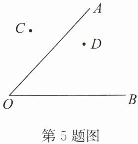 5. 如图,校园有两条路 OA,OB,在交叉口附近有两块宣传牌 C,D,学校准备在这里安装一盏路灯,要求灯柱的位置 P 离两块宣传牌一样远,并且到两条路的距离也一样远,请你用尺规作出灯柱的位置点 P.(保留作图痕迹)