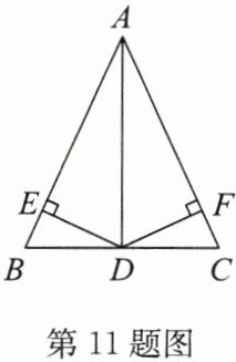 11. (2024·宿城期中)如图,$\triangle ABC$中,$AB =  AC$,$D是BC$的中点,$DE\perp AB于点E$,$DF\perp AC于点F$。