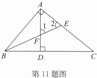 11. 如图,在 $ \triangle ABC $ 中,$ \angle BAC =  90^{\circ} $,$ BE $ 是角平分线,$ AD $ 是高,$ BE $,$ AD $ 相交于点 $ F $. 试说明:$ \angle 1 =  \angle 2 $.