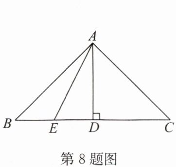 8. 如图,$ AD $ 是 $ \triangle ABC $ 的中线,也是 $ \triangle ABC $ 的高,$ AE $ 是 $ \triangle ABD $ 的中线,若 $ \triangle ABE $ 的面积为 $ 4 $,$ BC =  8 $,则 $ AD =  $