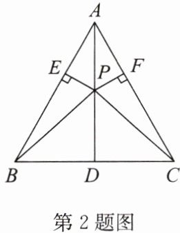 2. (2024·盐城大丰期末)如图,在 $\triangle ABC$ 中,$AB =  AC$,$D$ 是 $BC$ 的中点,$P$ 是 $AD$ 上任意一点,$PE \perp AB$ 于点 $E$,$PF \perp AC$ 于点 $F$。