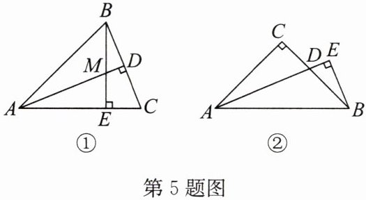 5. (2024·南京鼓楼区期末)(1)如图①,在 $\triangle ABC$ 中,$AB =  AC$,$\angle BAC =  45^{\circ}$。$\triangle ABC$ 的高 $AD$ 与高 $BE$ 相交于点 $M$。求证:$AM =  2CD$;