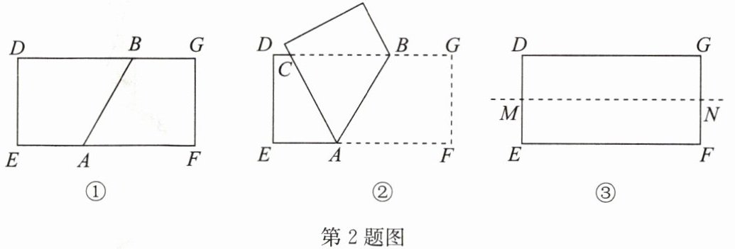 如图①,在长方形纸片 $ DEFG $ 上任意画一条线段 $ AB $,将纸片沿线段 $ AB $ 折叠(如图②).