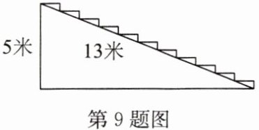 9. 某宾馆在重新装修后,准备在大厅的主楼梯上铺上红色地毯.已知楼梯的总高度为5米,楼梯长13米,主楼道宽2米.这种红色地毯的售价为每平方米30元,其侧面如图所示,则购买这种红色地毯至少需要