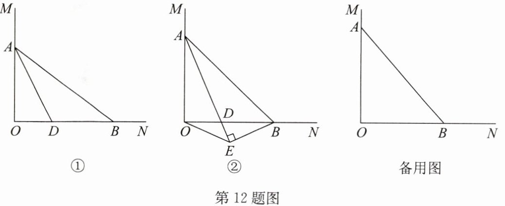 12. 已知 $ \angle MON =  90^{\circ} $,有一根长为 10 的木棒 $ AB $ 的两个端点 $ A $,$ B $ 分别在射线 $ OM $,$ ON $ 上滑动,$ \angle OAB $ 的平分线 $ AD $ 交 $ OB $ 于点 $ D $.
