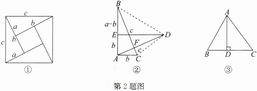 【方法运用】千百年来,人们对勾股定理的证明趋之若鹜,其中有著名的数学家,也有业余数学爱好者.向常春在2010年构造发现了一个新证法:把两个全等的直角$ \triangle ABC 和 \triangle DEA $如图②方式放置,其三边长分别为$ a,b,c,\angle BAC= \angle DEA =  90^{\circ} $,显然$ BC\perp AD $.