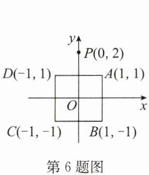 6. (2024·南京玄武区期末)如图,在平面直角坐标系中,正方形的顶点坐标分别为$A(1,1)$,$B(1,-1)$,$C(-1,-1)$,$D(-1,1)$,$y轴上有一点P(0,2)$.作点$P关于点A的对称点P_{1}$,作点$P_{1}关于点B的对称点P_{2}$,作点$P_{2}关于点C的对称点P_{3}$,作点$P_{3}关于点D的对称点P_{4}$,作点$P_{4}关于点A的对称点P_{5}$,作点$P_{5}关于点B的对称点P_{6}$,…,按此操作下去,点$P_{2024}$的坐标为(