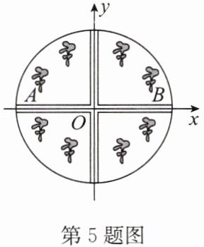 5. 某小区的圆形花园中间有两条互相垂直的小路,园丁在花园中栽种了8棵桂花树,如图所示.若$A$,$B$两处桂花树的位置关于小路对称,在分别以两条小路为$x$轴、$y$轴的平面直角坐标系内,若点$A的坐标为(-6,2)$,则点$B$的坐标为(
