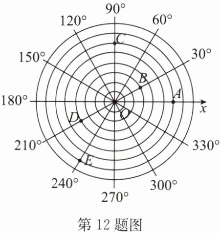 12. (2024·宿豫期末)【阅读理解】画一条水平数轴,记为 $ x $ 轴,以原点 $ O $ 为圆心,过 $ x $ 轴上的每一刻度点画同心圆,过原点 $ O $ 按逆时针方向画与 $ x $ 轴正半轴的角度分别为 $ 30^{\circ} $,$ 60^{\circ} $,$ 90^{\circ} $,$ 120^{\circ} $,$ 150^{\circ} $,…$  $,$ 330^{\circ} $ 的射线,这样就建立了“圆”坐标系。如图,在建立的“圆”坐标系内,我们可以将点 $ A $,$ B $,$ D $ 的坐标分别表示为 $ (6,0^{\circ}) $,$ (3,30^{\circ}) $,$ (4,210^{\circ}) $。