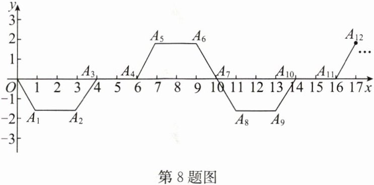 8. (2024·绥化)如图,已知 $A_1(1,-\sqrt{3})$,$A_2(3,-\sqrt{3})$,$A_3(4,0)$,$A_4(6,0)$,$A_5(7,\sqrt{3})$,$A_6(9,\sqrt{3})$,$A_7(10,0)$,$A_8(11,-\sqrt{3})$,…$$,以此规律,点 $A_{2024}$ 的坐标为______.