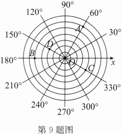 9. 画一条水平数轴,以原点 $ O $ 为圆心,过数轴上的每一刻度点画同心圆,过原点 $ O $ 按逆时针方向依次画出与正半轴的角度分别为 $ 30^{\circ} $,$ 60^{\circ} $,$ 90^{\circ} $,$ 120^{\circ} $,…,$ 330^{\circ} $ 的射线,这样就建立了“圆”坐标系。如图,在建立的“圆”坐标系内,我们可以将点 $ A $,$ B $,$ C $ 的坐标分别表示为 $ A(6,60^{\circ}) $,$ B(5,180^{\circ}) $,$ C(4,330^{\circ}) $,则点 $ D $ 的坐标可以表示为______。