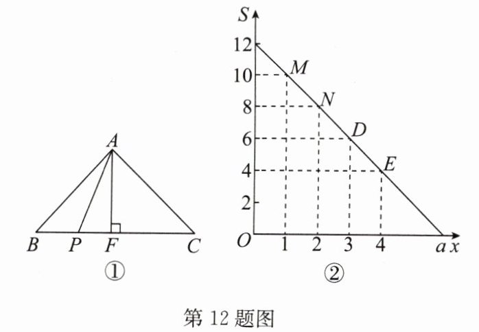 12. 如图①,在 $ \triangle ABC $ 中,$ BC =  6 $,$ AF $ 为 $ BC $ 边上的高,$ P $ 是 $ BC $ 上一动点,沿 $ BC $ 由点 $ B $ 向点 $ C $ 运动,连接 $ AP $,在这个变化过程中设 $ BP =  x $,且把 $ x $ 看成自变量.