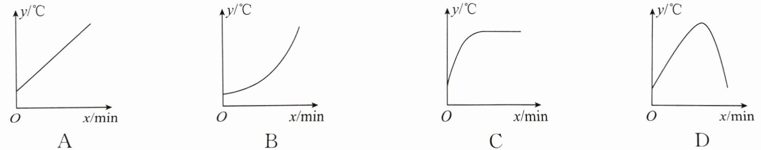 6. (2024·江西)将常温中的温度计插入一杯 $ 60^{\circ}C $ 的热水(恒温)中,温度计的读数 $ y(^{\circ}C) $ 与时间 $ x(min) $ 的关系用图象可近似表示为(