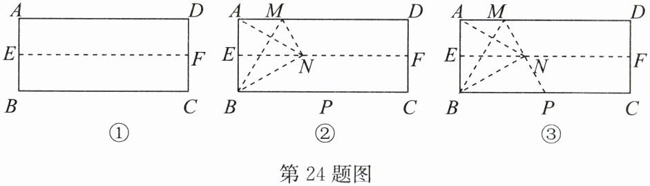 操作②:再一次折叠纸片,使点$A落在EF$上,并使折痕经过点$B$,得到折痕$BM$,同时得到线段$BN$,连接$AN$,$MN$(如图②).