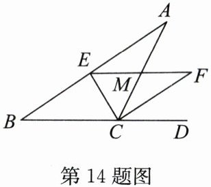 14. 如图,在△ABC中,CE平分∠ACB,CF平分∠ACD,且EF//BC交AC于点M,若CM= 3,则$CE^2+CF^2$的值为