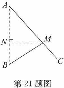 21. (10分)如图,某小区有两个喷泉A,B,两个喷泉的距离为125 m. 现要为喷泉铺设供水管道AM,BM,供水点M在小路AC上,供水点M到AB的距离MN的长为60 m,BM的长为75 m.
