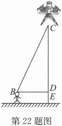 22. (10分)“儿童散学归来早,忙趁东风放纸鸢”. 又到了放风筝的最佳时节,某校八年级(1)班的小明和小亮学习了“勾股定理”之后,为了测得如图所示的风筝的垂直高度CE,他们进行了如下操作:①测得水平距离BD的长为15米;②根据手中剩余线的长度计算出风筝线BC的长为25米;③牵线放风筝的小明的身高为1.6米. 求风筝的垂直高度CE.