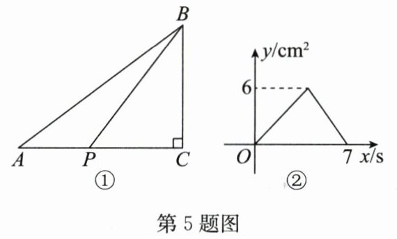 5. (2024·广元)如图①,在$\triangle ABC$中,$\angle ACB = 90^{\circ}$,点$P从点A出发沿A\rightarrow C\rightarrow B以1\ cm/s的速度匀速运动至点B$,图②是点$P$运动时,$\triangle ABP的面积y(cm^2)随时间x(s)$变化的函数图象,则该三角形的斜边$AB$的长为(