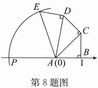 8. 如图,$ AB =  BC =  CD =  DE $,$ \angle CBA =  \angle DCA =  \angle EDA =  90^{\circ} $,以点 $ A $ 为圆心,$ AE $ 长为半径画弧与数轴交于点 $ P $,点 $ A $,$ B $ 表示的数分别为 $ 0 $,$ 1 $,则点 $ P $ 表示的数为