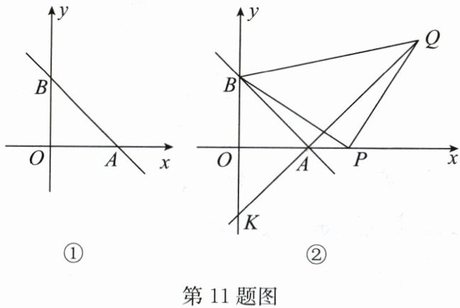 (3) 如图②,$ P $ 为 $ A $ 点右侧 $ x $ 轴上的一动点,以 $ P $ 为直角顶点,$ BP $ 为腰在第一象限内作等腰直角 $ \triangle BPQ $,连接 $ QA $ 并延长交 $ y $ 轴于点 $ K $. 当 $ P $ 点运动时,$ K $ 点的位置是否发生变化?如果不变,请求出它的坐标;如果变化,请说明理由.