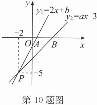 10. (15 分)(2024·宿迁期末)如图,已知函数 $y_{1}= 2x + b$ 和 $y_{2}= ax - 3$ 的图象交于点 $P(-2,-5)$,这两个函数的图象与 $x$ 轴分别交于点 $A,B$.