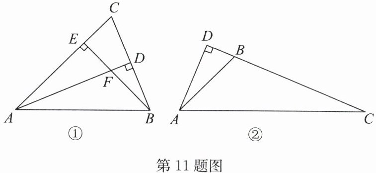 11. (15 分)(2024·宿城期中)【探索发现】如图①,已知在$\triangle ABC$中,$\angle BAC =  45^{\circ}$,$AD\perp BC$,垂足为 $D$,$BE\perp AC$,垂足为 $E$,$AD$ 与 $BE$ 相交于点 $F$.