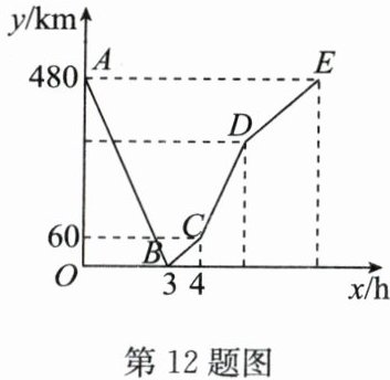 12. (15 分)(2024·宿豫期末)一辆快车从甲地驶往乙地,一辆慢车从乙地驶往甲地,两车同时出发,匀速行驶,两车在途中相遇时,快车恰巧出现故障,慢车继续驶往甲地,快车维修好后按原速继续驶往乙地,两车到达各自终点后停止,两车之间的距离$y(km)与慢车行驶的时间x(h)$之间的关系如图所示.