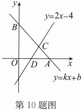 10. (14 分)如图,已知直线 $ y =  kx + b $ 交 $ x $ 轴于点 $ A $,交 $ y $ 轴于点 $ B $,直线 $ y =  2x - 4 $ 交 $ x $ 轴于点 $ D $,交直线 $ AB $ 于点 $ C(3,2) $.