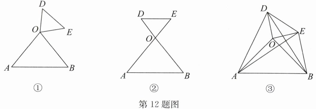 12. (16 分)定义:两个顶角相等且顶角顶点重合的等腰三角形称为“同根等腰三角形”,如图①,$ OD =  OE $,$ OA =  OB $,$ O $ 为重合的顶角顶点且 $ \angle DOE =  \angle AOB $,所以 $ \triangle ODE $ 与 $ \triangle OAB $ 是“同根等腰三角形”.