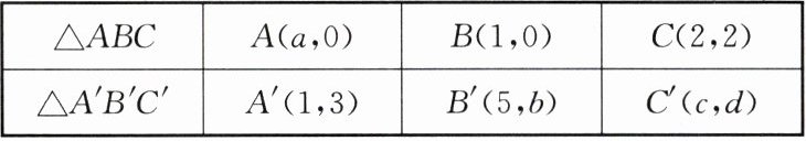 24. (10 分)在如图所示的平面直角坐标系中,每个小方格的边长表示 1 个单位长度,将$\triangle ABC平移后得到\triangle A'B'C'$,它们的三个顶点坐标如下表。