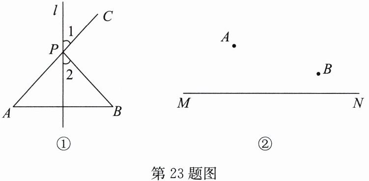 (2) 尺规作图:如图②,点$A$,$B是直线MN$外同侧的两点,请用无刻度的直尺和圆规在直线$MN上求作一点P$,使得$\angle APM= \angle BPN$。(保留作图痕迹,不写作法)