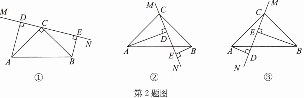 2. 在$\triangle ABC$中,$\angle ACB= 90^{\circ}$,$AC= BC$,直线$MN经过点C$,且$AD\perp MN于点D$,$BE\perp MN于点E$.