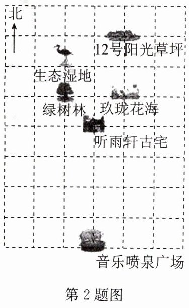 2. 周末,小华和小军相约去九龙湖游玩. 小华和小军对着如图所示的部分景区示意图分别描述玖珑花海的位置(图中小正方形的边长代表 300 米,所有景点都在格点上). 小华说:“玖珑花海在听雨轩古宅的东北方向约 420 米处.”小军说:“玖珑花海的坐标是 $(300,300)$.”