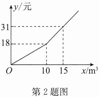 2. 我国很多城市水资源匮乏,为了加强居民的节水意识,某自来水公司采取分段收费方式.某市居民月缴水费y(元)与用水量$x(m^3)$之间的关系如图所示.若某户居民4月份用水$20 m^3,$则应缴水费