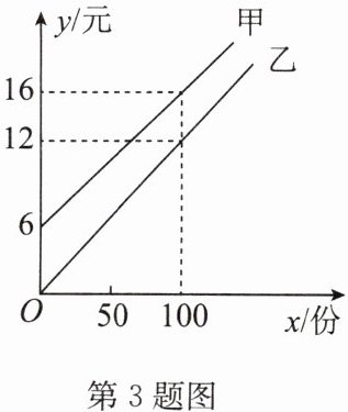 3. 某校实行学案式教学,需印制若干份数学学案,印刷厂有甲、乙两种收费方式,除按印数收取印刷费外,甲种方式还需收取制版费而乙种不需要.两种印刷方式的费用y(元)与印刷份数x(份)之间的关系如图所示.