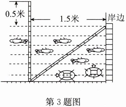 3. 老师准备测量一段河水的深度,他把一根竹竿插到离岸边 $ 1.5 $ 米远的水底,竹竿露出水面的部分刚好 $ 0.5 $ 米,把竹竿的顶端拉向岸边,竿顶和岸边的水面刚好相齐,请你帮老师计算河水的深度.