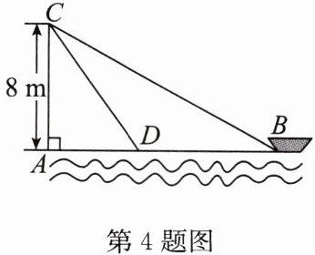 4. 如图,在离水面高度为 $ 8 $ m 的岸上,有人用绳子拉船靠岸,开始时绳子 $ BC $ 的长为 $ 17 $ m,几分钟后船到达点 $ D $ 的位置,此时绳子 $ CD $ 的长为 $ 10 $ m,问船向岸边移动了多少米?
