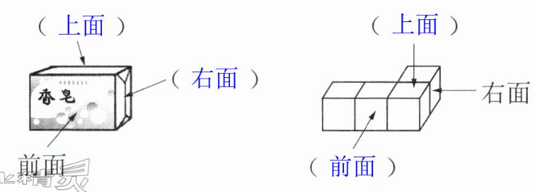 观察物体,第一个图有“收纳箱”字样,是前面;第二个图有圆形,是上面;第三个图是侧面,即右面。