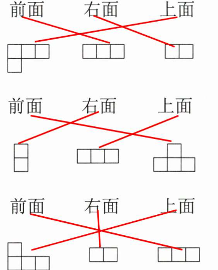 1. 用4个同样大的正方体摆成左边的样子,右边的图形分别是从哪一面看到的?请连一连。