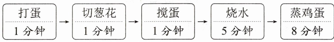 $\boxed{\begin{array}{l}打蛋\\1 分钟\end{array} }\to\boxed{\begin{array}{l}切葱花\\1 分钟\end{array} }\to\boxed{\begin{array}{l}搅蛋\\1 分钟\end{array} }\to\boxed{\begin{array}{l}烧水\\5 分钟\end{array} }\to\boxed{\begin{array}{l}蒸鸡蛋\\8 分钟\end{array} }$