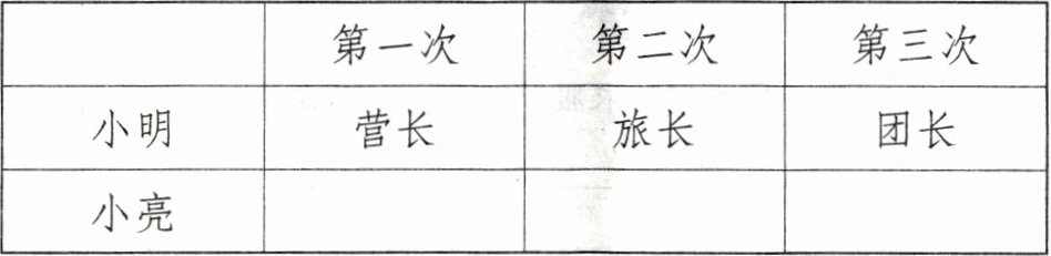 5. 小明和小亮各有“旅长、团长、营长”3 枚军旗,每人每次出一枚,级别最高的获胜。如果小明先出,三局两胜,请你填写小亮的出棋顺序,使小亮获胜。(旅长>团长>营长)