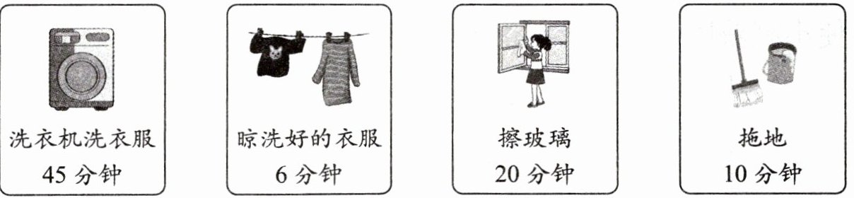 |洗衣机洗衣服45分钟|晾洗好的衣服6分钟|擦玻璃20分钟|拖地10分钟|