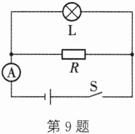 答案:9. (1) 灯泡 L 的规格为 “6 V 3 W”,根据 $P = UI$ 可知,通过灯泡 L 的电流 $I = \frac{P_L}{U_L} = \frac{3W}{6V} = 0.5A$ (2) 闭合开关 S,电流表测干路的电流,灯泡正常发光,两端电压为 6 V,即电源电压,通过灯泡的电流为 0.5 A,电流表示数为 1.5 A,由并联电路电流规律可知,通过 R 的电流 $I_R = I_{总} - I_L = 1.5A - 0.5A = 1A$,电阻 R 的电功率 $P = UI_R = 6V × 1A = 6W$ (3) 通电 2 min,电路消耗的电能 $W = UI_{总}t = 6V × 1.5A × 2 × 60s = 1080J$