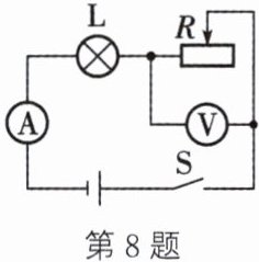 8. 如图所示,电源电压为 6 V,当小灯泡正常发光时,电压表的示数为 2 V,电流表的示数为 0.5 A,则小灯泡的额定功率是 (