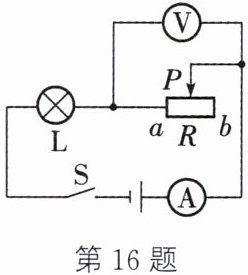 答案:16. (1) 灯泡的电阻 $R_L = \frac{U_{额}^2}{P_{额}} = \frac{(6V)^2}{4W} = 9\Omega$,电源的电压 $U = IR_L = 0.5A × 9\Omega = 4.5V$ (2) 当滑片 P 移至 b 端时,灯泡与滑动变阻器的最大电阻串联,灯泡两端的电压 $U_L = U - U_{滑} = 4.5V - 3V = 1.5V$,电路中的电流 $I' = \frac{U_L}{R_L} = \frac{1.5V}{9\Omega} = \frac{1}{6}A$,滑动变阻器的最大阻值 $R_{滑} = \frac{U_{滑}}{I'} = \frac{3V}{\frac{1}{6}A} = 18\Omega$ (3) 滑片 P 位于 b 端时,$I' = \frac{1}{6}A$,电路消耗的总功率 $P_{总} = UI' = 4.5V × \frac{1}{6}A = 0.75W$