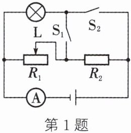 答案:(1)小灯泡的额定电流$I_{\mathrm{L}}=\frac{P_{\mathrm{L}}}{U_{\mathrm{L}}}=\frac{3\ W}{12\ V}=0.25\ A$(2)当$S_1$、$S_2$都闭合时,$R_2$被短路,$L$、$R_1$并联,$L$恰好正常发光,则通过小